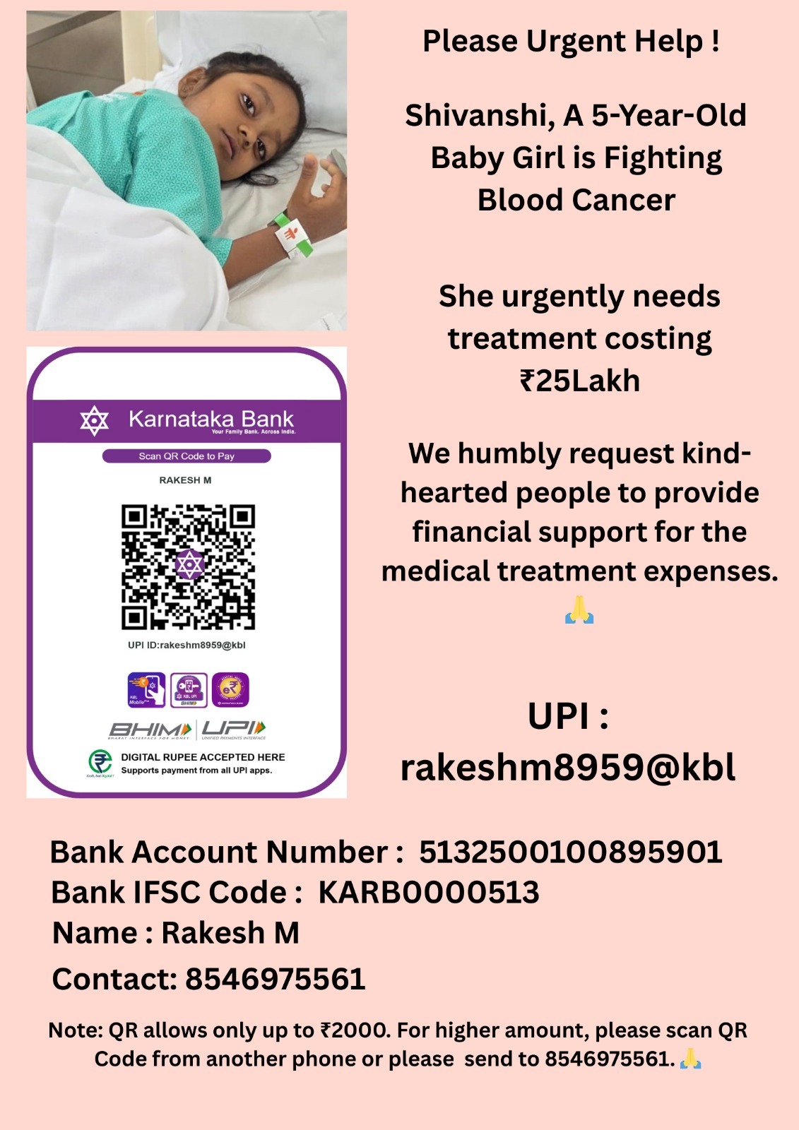 ಮಂಗಳೂರಿನ ಪಡೀಲ್ ನಿವಾಸಿ ರಾಕೇಶ್- ಸುಮಾ ದಂಪತಿಯ 5 ವರ್ಷದ ಬಾಲೆ ಶಿವಾನ್ಶಿ ಅನಾರೋಗ್ಯಕ್ಕೀಡಾಗಿ, ಮಂಗಳೂರಿನ ಕೆಎಂಸಿ ಆಸ್ಪತ್ರೆಯಲ್ಲಿ ಚಿಕಿತ್ಸೆ ಪಡೆಯುತ್ತಿದ್ದಾಳೆ. ಡಾ. ಹರ್ಷ ಪ್ರಸಾದ್ ಅವರು ಮಗುವಿಗೆ ಚಿಕಿತ್ಸೆ ನೀಡುತ್ತಿದ್ದು, 25ರಿಂದ 30 ಲಕ್ಷ ವೆಚ್ಚವಾಗಬಹುದು ಎಂದು ತಿಳಿಸಿದ್ದಾರೆ. ಆದರೆ ದಾನಿಗಳ ನೆರವಿನಿಂದ ಕೇವಲ ಒಂದು ಲಕ್ಷವಷ್ಟೇ ಕೈ ಸೇರಿದೆ. ಇನ್ನೂ ಬಹು ದೊಡ್ಡ ಮೊತ್ತದ ಹಣದ ಅವಶ್ಯಕತೆ ಇರುವುದರಿಂದ ಶಿವಾನ್ಶಿಯ ಕುಟುಂಬ ಕಂಗಾಲಾಗಿದೆ. ಒಂದೆಡೆ ಆಸ್ಪತ್ರೆಗೆ ಅಲೆದಾಟ ಮಗುವಿನ ಆರೈಕೆ ಜೊತೆಗೆ ದಾನಿಗಳ ಬಳಿಗೆ ತೆರಳಿ ಸಹಾಯ ಕೇಳುವ ಪರಿಸ್ಥಿತಿಯಲ್ಲಿ ಕುಟುಂಬ ಇಲ್ಲ. ಹಾಗಾಗಿ ಶಿವಾನ್ಶಿಯ ಬಾಳಿಗೊಂದು ಬೆಳಕಾಗಬೇಕೆಂದು ಕುಟುಂಬ ಕಣ್ಣೀರಿಟ್ಟು ಸಹಾಯ ಯಾಚಿಸುತ್ತಿದೆ.