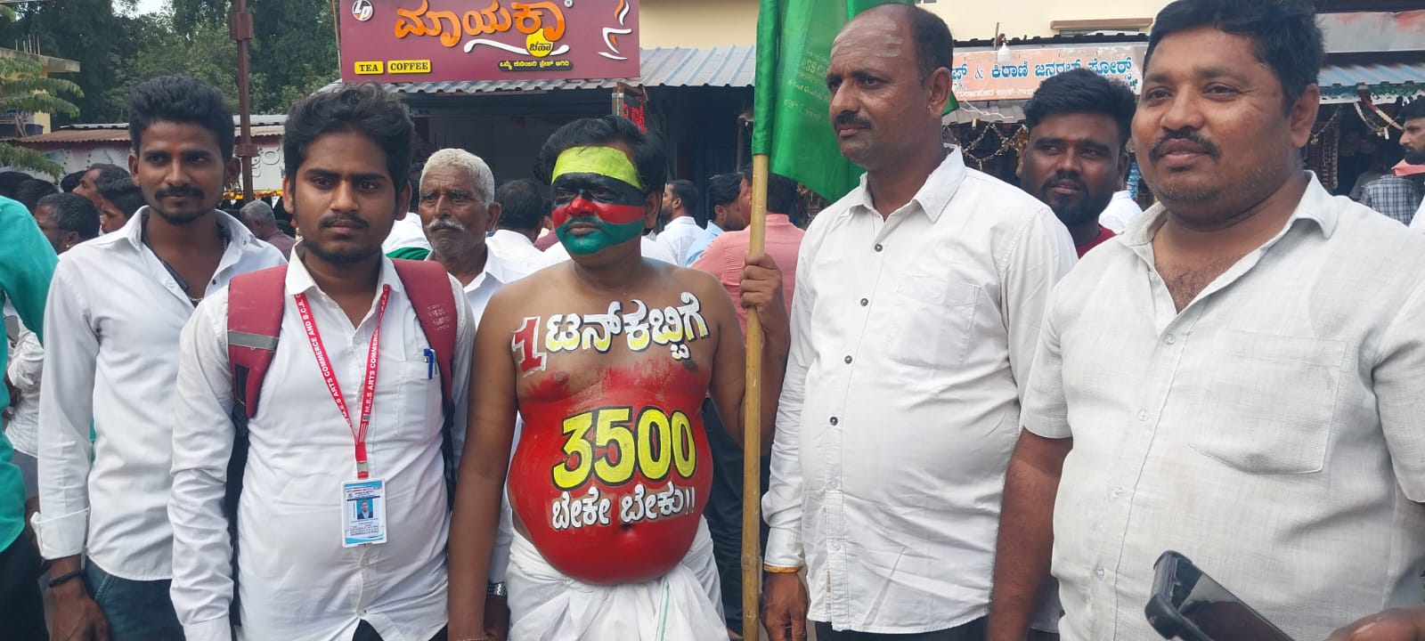 ಮೂಡಲಗಿ: ಪಟ್ಟಣ ಸಮೀಪದ ಗುರ್ಲಾಪೂರ ಕ್ರಾಸ್ ಹೆದ್ದಾರಿ ಮೇಲೆ ಏಳು ದಿನಗಳಿಂದ ರಾಜ್ಯ ರೈತ ಸಂಘ ಮತ್ತು ಹಸಿರು ಸೇನೆ ಹಾಗೂ ಕಬ್ಬು ಬೆಳೆಗಾರರು ನಡೆಸುತ್ತಿರುವ ಅಹೋರಾತ್ರಿ ಧರಣಿ ದಿನದಿಂದ ದಿನಕ್ಕೆ ತೀವ್ರ ಸ್ವರೂಪ ಪಡೆಯುತ್ತಿದ್ದು ಈ ಬ್ರಹತ್ ಪ್ರತಿಭಟನೆಗೆ ಅನೇಕ ಮಠಾಧೀಶರು ಪಕ್ಷಾತೀತವಾಗಿ ರಾಜಕೀಯ ಮುಖಂಡರು ವಕೀಲರು, ಕಲಾವಿದರು, ಕಾಲೇಜು ವಿದ್ಯಾರ್ಥಿಗಳು, ವ್ಯಾಪಾರಸ್ಥರು, ಪತ್ರಕರ್ತರು ಸೇರಿದಂತೆ ಅನೇಕ ಮುಖಂಡರು ಮುಷ್ಕರಕ್ಕೆ ತಮ್ಮ ಬೆಂಬಲ ಸೂಚಿಸಿದ್ದಾರೆ ಅದೇ ರೀತಿ ಇಲ್ಲಿನ ಹವ್ಯಾಸಿ ಕಲಾವಿದ ಹಾಗೂ ಸ್ವತಃ ರೈತರೂ ಆಗಿರುವ ಸುರೇಶ ಬೆಳವಿ ಅವರು ಸರ್ಕಾರದ ಗಮನ ಸೆಳೆಯಲು ಬರಿಮೈಗೆ ಬಣ್ಣ ಬಳಿದು ಪ್ರತಿ ಟನ್ ಕಬ್ಬಿಗೆ ಸರ್ಕಾರ 3500 ರೂ ಕೊಡಲೇಬೇಕು ಎಂದು ಬರೆದು ಹಿಂಬದಿ ಕಬ್ಬು ಚಿತ್ರ ಹಾಕಿ ವಿನೂತನ ಪ್ರತಿಭಟನೆ ಮಾಡುವ ಮೂಲಕ ಗಮನ ಸೆಳೆದರು.