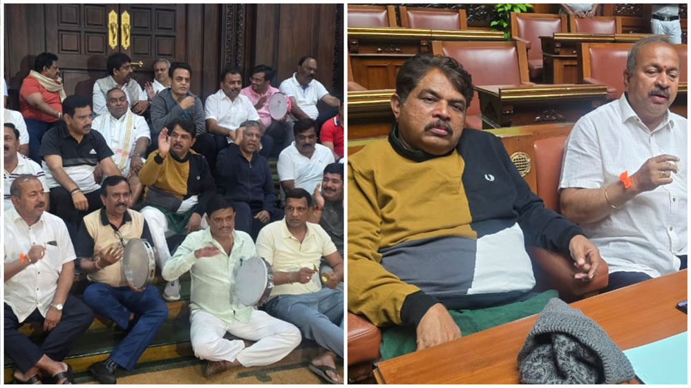 ಮೊಗಸಾಲೆ ಪ್ರವೇಶ ದ್ವಾರದಲ್ಲಿ ಕುಳಿತ ಸದಸ್ಯರು ತಮಟೆ ಬಾರಿಸಿ ಆಕ್ರೋಶ ಹೊರಹಾಕಿದರು. ಕೋಟಿ ಕೋಟಿ ಲೂಟಿ, ರಾಜೀನಾಮೆ ಕೊಡಲೇಬೇಕು ಎಂದು ಹಾಡು ಹಾಡಿದರು. ಗೋವಿಂದ ಗೋವಿಂದ ಕೋಟಿ ಕೋಟಿ ಗೋವಿಂದ ಘೋಷಣೆ ಮೂಲಕ ವ್ಯಂಗ್ಯ ಮಾಡಿದರು. ನಂತರ ವಿಧಾನಸೌಧದ ಕಾರಿಡಾರ್‌ನಲ್ಲಿ ಹೆಜ್ಜೆ ಹಾಕಿ ಹಾಡನ್ನು ಹಾಡುವ ಮೂಲಕ ಪ್ರತಿಭಟಿಸಿದರು. ರಾತ್ರಿ ವಿಧಾನಸೌಧದ ಮೊಗಸಾಲೆಗೆ ಹಾಸಿಗೆಗಳನ್ನು ತಂದು ಸದಸ್ಯರು ನಿದ್ದೆ ಮಾಡಿದರು.