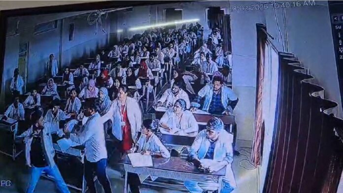 ಹೋಮಿಯೋಪಥಿಕ್ ಮಟೇರಿಯಾ ಮೆಡಿಕಾ ವಿಷಯದ ಆಂತರಿಕ ಪರೀಕ್ಷೆ ನಡೆಯುತ್ತಿದ್ದ ವೇಳೆ ಶಹಬಾಜ್ ಎಂಬ ವಿದ್ಯಾರ್ಥಿ ಮೊಬೈಲ್ ಫೋನ್ ಬಳಸಿ ಕಾಪಿ ಮಾಡಲು ಮುಂದಾಗಿದ್ದ ಎನ್ನಲಾಗಿದೆ. ಈ ವೇಳೆ ಸಹಾಯಕ ಪ್ರಾಧ್ಯಾಪಕ ಶಿವರಾಜ್ ಕುಮಾರ್ ಅವರು ವಿದ್ಯಾರ್ಥಿಯನ್ನು ಪ್ರಶ್ನಿಸಿ, ಉತ್ತರ ಪತ್ರಿಕೆಯನ್ನು ವಶಪಡಿಸಿಕೊಂಡಿದ್ದಾರೆ.