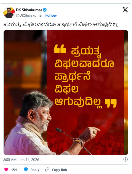 ಪ್ರಯತ್ನ ವಿಫಲವಾದರೂ ಪ್ರಾರ್ಥನೆ ವಿಫಲ ಆಗುವುದಿಲ್ಲ ಎಂದು ಡಿಕೆಶಿ ತಮ್ಮ ಎಕ್ಸ್ ಖಾತೆಯಲ್ಲಿ ಪೋಸ್ಟ್ ಮಾಡಿದ್ದಾರೆ.
