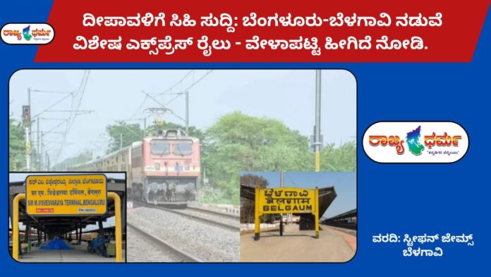 ರೈಲು ಸಂಖ್ಯೆ 06504 ಬೆಳಗಾವಿ-ಸರ್ ಎಂ. ವಿಶ್ವೇಶ್ವರಯ್ಯ ಟರ್ಮಿನಲ್ ಬೆಂಗಳೂರು ವಿಶೇಷ ಎಕ್ಸ್ಪ್ರೆಸ್ ರೈಲು ಅಕ್ಟೋಬರ್ 22, 2025 ರಂದು ಬೆಳಗಾವಿಯಿಂದ ಸಂಜೆ 5:30 ಗಂಟೆಗೆ ಹೊರಟು, ಮರುದಿನ ಬೆಳಿಗ್ಗೆ 5:00 ಗಂಟೆಗೆ ಎಸ್ಎಂವಿಟಿ ಬೆಂಗಳೂರು ತಲುಪಲಿದೆ.