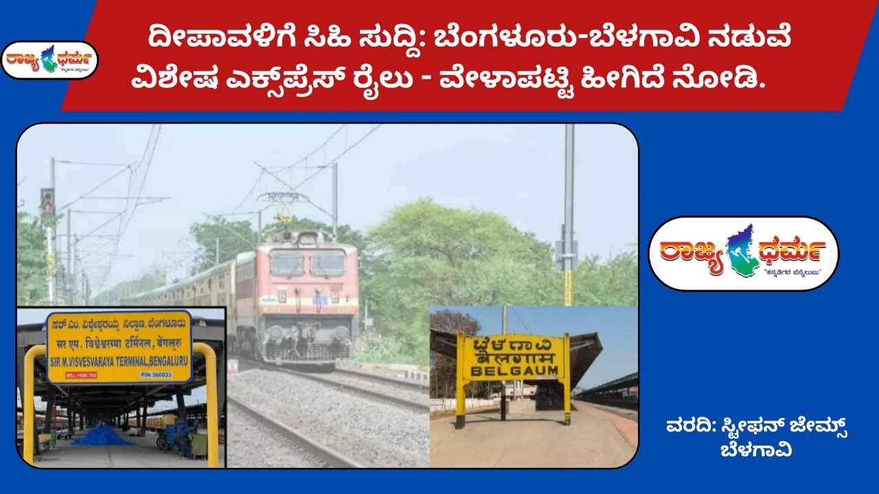 ನೈರುತ್ಯ ರೈಲ್ವೆಯು ಸರ್ ಎಂ. ವಿಶ್ವೇಶ್ವರಯ್ಯ ಟರ್ಮಿನಲ್ ಬೆಂಗಳೂರು ಮತ್ತು ಬೆಳಗಾವಿ ನಡುವೆ ಒಂದು ಟ್ರಿಪ್ ವಿಶೇಷ ರೈಲನ್ನು ಓಡಿಸಲು ನಿರ್ಧರಿಸಿದೆ. ಅಕ್ಟೋಬರ್ 17 ಹಾಗೂ 22 ರಂದು ಈ ರೈಲು ಸಂಚಾರ ನಡೆಸಲಿದೆ.