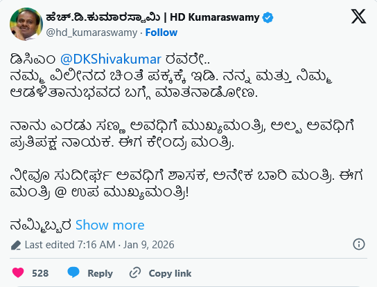 ಇನ್ನೂ ಡಿಕೆಶಿ ಅವರ ಈ ಮಾತಿಗೆ ಟಾಂಗ್ ಕೊಟ್ಟ ಕುಮಾರಸ್ವಾಮಿ, ತಮ್ಮ ಸಾಮಾಜಿಕ ಜಾಲತಾಣ ಎಕ್ಸ್ ಖಾತೆಯಲ್ಲಿ ಪೋಸ್ಟ್ ಮಾಡಿದ್ದು, ನಮ್ಮ ವಿಲೀನದ ಚಿಂತೆ ಪಕ್ಕಕ್ಕಿಡಿ. ನನ್ನ, ನಿಮ್ಮ ಆಡಳಿತಾನುಭವದ ಬಗ್ಗೆ ಮಾತನಾಡೋಣ ಎನ್ನುತ್ತಾ ಕಿಡಿಕಾರಿದ್ದಾರೆ. ನಾನು ಎರಡು ಸಣ್ಣ ಅವಧಿಗೆ ಮುಖ್ಯಮಂತ್ರಿ, ಅಲ್ಪ ಅವಧಿಗೆ ಪ್ರತಿಪಕ್ಷ ನಾಯಕ. ಈಗ ಕೇಂದ್ರ ಮಂತ್ರಿ. ನೀವೂ ಸುದೀರ್ಘ ಅವಧಿಗೆ ಶಾಸಕ, ಅನೇಕ ಬಾರಿ ಮಂತ್ರಿ. ಈಗ ಮಂತ್ರಿ ಉಪ ಮುಖ್ಯಮಂತ್ರಿ! ನಮ್ಮಿಬ್ಬರ ಆಡಳಿತಾನುಭವದ ಬಗ್ಗೆ ನೀವು ಹೇಳುವುದಲ್ಲ, ಜನರನ್ನೇ ಕೇಳಬೇಕು ಎಂದು ಕುಮಾರಸ್ವಾಮಿ ಬರೆದಿದ್ದಾರೆ.