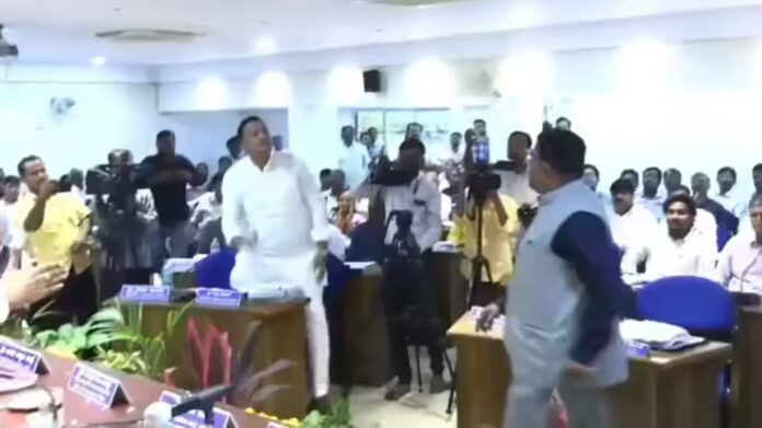 ವೇದಿಕೆಯ ಮೇಲೆ ಸಚಿವರು ಮತ್ತು ಎದುರುಗಡೆ ಹಿರಿಯ ಅಧಿಕಾರಿಗಳು ಕುಳಿತಿದ್ದರೂ ಲೆಕ್ಕಿಸದೆ, ಇಬ್ಬರೂ ಜನಪ್ರತಿನಿಧಿಗಳು ಆಕ್ರೋಶಗೊಂಡು ಪರಸ್ಪರ ದೈಹಿಕವಾಗಿ ಹಲ್ಲೆ ಮಾಡುವ ಹಂತಕ್ಕೆ ಮುಂದಾದರಲ್ಲದೆ ಒಬ್ಬರ ಕೈ ಇನ್ನೊಬ್ಬರು ಹಿಡಿದು ಎಳೆದಾಡಲಾರಂಭಿಸಿದರು.