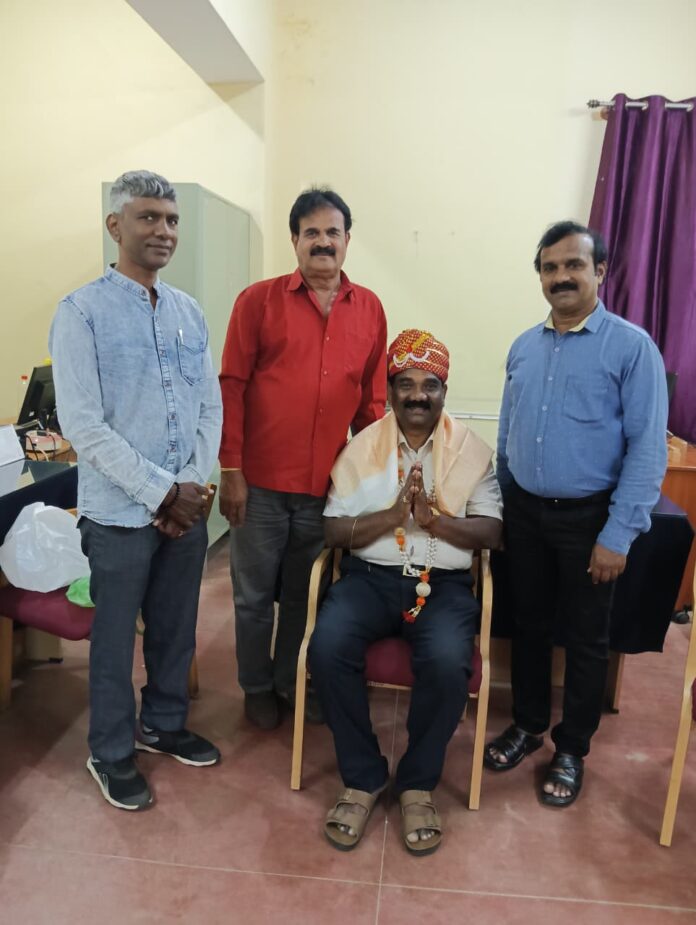 ಹುಣಸೂರು: ಮೈಸೂರಿನ ಅಖಿಲ ಭಾರತ ವಾಕ್ ಮತ್ತು ಶ್ರವಣ ಸಂಸ್ಥೆಯಲ್ಲಿ 30 ವರ್ಷಗಳ ಕಾಲ ಮನಶಾಸ್ತ್ರಜ್ಞರಾಗಿ ಸೇವೆಯನ್ನು ಸಲ್ಲಿಸಿ ನಿವೃತ್ತರಾದ ಹೆಚ್. ಹೆಚ್. ರಾಜು ರವರನ್ನು ಕುಮಾರ್ ಅರಸೇಗೌಡ ಮಿತ್ರ ಬಳಗದ ವತಿಯಿಂದ ಸನ್ಮಾನಿಸಲಾಯಿತು. ನಟ ಕುಮಾರ್ ಅರಸೇಗೌಡ, ಚಿತ್ರನಟ ಡಿ.ಆರ್. ಮುರಳೀಧರ್ ಹಾಗು ಸಂಸ್ಥೆಯ ಡಾ.ಪುರುಷೋತ್ತಮ್ ಇದ್ದಾರೆ.