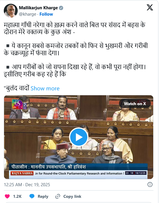 ಮುಂದುವರೆದು, ದೇಶದ ಜನರು VB-G RAM G ಕಾನೂನು ವಿರುದ್ಧ ಬೀದಿಗಿಳಿದು ಪ್ರತಿಭಟಿಸಲಿದ್ದಾರೆ. ಅವರು ನಿಮ್ಮ ಗುಂಡುಗಳನ್ನು ಎದುರಿಸುತ್ತಾರೆಯೇ ಹೊರತು ಈ ಕಾನೂನನ್ನು ಎಂದಿಗೂ ಬೆಂಬಲಿಸುವುದಿಲ್ಲ. ನಾವು ಹೋರಾಟವನ್ನು ಮುಂದುವರಿಸುತ್ತೇವೆ ಎಂದು ಎಐಸಿಸಿ ಅಧ್ಯಕ್ಷರು ತೀವ್ರ ವಾಗ್ದಾಳಿ ನಡೆಸಿದರು. VB-G RAM G ವಿಧೇಯಕಕ್ಕೆ ಲೋಕಸಭೆ ಅಂಕಿತ ಹಾಕಿದ್ದು, ಈ ಮಸೂದೆ ಬಗ್ಗೆ ಈಗ ರಾಜ್ಯಸಭೆ ಗಂಭೀರ ಚರ್ಚೆ ನಡೆಸುತ್ತಿದೆ. ಪ್ರತಿಪಕ್ಷ ಕಾಂಗ್ರೆಸ್‌ MGNREGA ಯೋಜನೆಯ ಮರುನಾಮಕರಣವನ್ನು ವಿರೋಧಿಸಿ ತೀವ್ರ ಪ್ರತಿಭಟನೆ ಆರಂಭಿಸಿದೆ. ಸಂಸತ್ತಿನ ಆವರಣದಲ್ಲಿ ಕಾಂಗ್ರೆಸ್‌ ಸಂಸದರು ಪ್ರಿಯಾಂಕಾ ಗಾಂಧಿ ನೇತೃತ್ವದಲ್ಲಿ ಪ್ರತಿಭಟನೆ ನಡೆಸಿದ್ದಾರೆ ಎನ್ನಲಾಗಿದೆ.