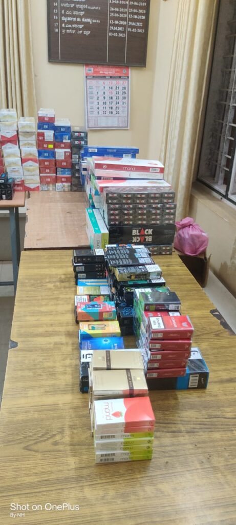 ಈ ಅಂಗಡಿಗಳಲ್ಲಿ ಕೇಂದ್ರ ಸರಕಾರ ನಿಷೇಧಿಸಿದ ಇ-ಸಿಗರೇಟ್ ಗಳನ್ನು ಅಕ್ರಮ ಮಾರಾಟ ಮಾಡಿದ್ದಲ್ಲದೆ ಸರ್ಕಾರದ ಎಚ್ಚರಿಕೆಯನ್ನು ನಮೂದಿಸದೆ ಕಾನೂನು ಬಾಹಿರವಾಗಿ ವಿದೇಶಿ ಸಿಗರೇಟ್ ಮಾರಾಟ ಮಾಡುತ್ತಿರುವ ಬಗ್ಗೆ ಖಚಿತ ಮಾಹಿತಿ ಪಡೆದ ಪೊಲೀಸರು ದಾಳಿ ನಡೆಸಿ ಸುಮಾರು 2.70 ಲಕ್ಷ ರೂ.ಮೌಲ್ಯದ ಇ-ಸಿಗರೇಟ್ ಹಾಗೂ ವಿದೇಶಿ ಸಿಗರೇಟ್ ವಶಪಡಿಸಿಕೊಳ್ಳಲಾಗಿದೆ.
