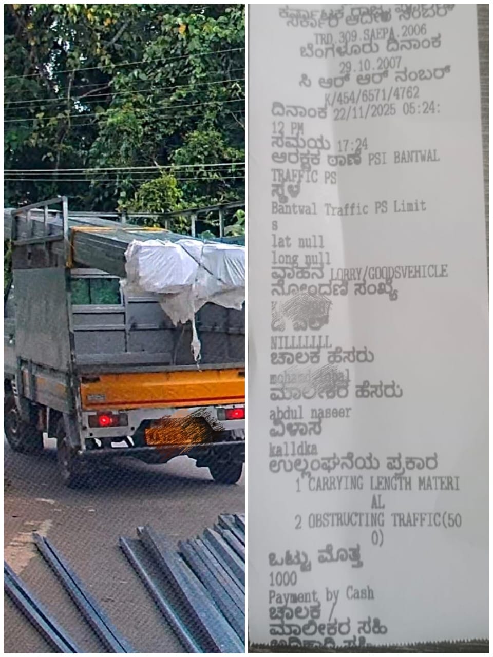 ಮಂಗಳೂರು (ದಕ್ಷಿಣ ಕನ್ನಡ): ದಕ್ಷಿಣ ಕನ್ನಡ ಜಿಲ್ಲೆಯ ಬಂಟ್ವಾಳ ಸಂಚಾರ ಪೊಲೀಸ್ ಠಾಣಾ ವ್ಯಾಪ್ತಿಯ ಬೋಳಂತೂರು ಎಂಬಲ್ಲಿ ಗೂಡ್ಸ್ ವಾಹನದಲ್ಲಿ ಸಂಚಾರ ನಿಯಮವನ್ನು ಉಲ್ಲಂಘಿಸಿ ಅಪಾಯಕಾರಿಯಾಗಿ ಸಾಮಾಗ್ರಿಗಳನ್ನು ಸಾಗಿಸುತ್ತಿದ್ದ ವಿಡಿಯೊವೊಂದು ಸಾಮಾಜಿಕ ಜಾಲತಾಣದಲ್ಲಿ ಪ್ರಸಾರ ಆಗಿತ್ತು. ಈ ವಾಹನಕ್ಕೆ ಸಂಚಾರ ನಿಯಮದ ಅನ್ವಯ ಸೂಕ್ತ ದಂಡ ವಿಧಿಸಲಾಗಿದೆ ಎಂದು ಇಂದು ಪ್ರಕಟಣೆಯಲ್ಲಿ ಪೊಲೀಸ್ ಇಲಾಖೆ ತಿಳಿಸಿದೆ.