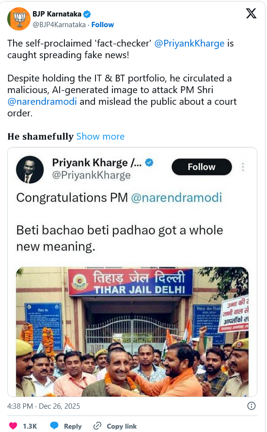 ಈ ನಡುವೆ ನಕಲಿ ಸುದ್ದಿ ಮಸೂದೆಯಡಿ ಹೆಸರು ಮತ್ತು ಅವಮಾನದ ಸ್ವಯಂ ಘೋಷಿತ ಪ್ರತಿಪಾದಕ ಪ್ರಿಯಾಂಕ ಖರ್ಗೆ ಈಗ ಸ್ವತಃ ನಕಲಿ ಸುದ್ದಿಗಳನ್ನು ಸೃಷ್ಟಿಸಿ ಸಿಕ್ಕಿಬಿದ್ದಿದ್ದಾರೆ ಎಂದು ಪ್ರಲ್ಹಾದ ಜೋಶಿ ಆರೋಪಿಸಿದ್ದಾರೆ. ಅಲ್ಲದೆ ಜನರನ್ನು ದಾರಿ ತಪ್ಪಿಸಲು, ಅವ್ಯವಸ್ಥೆ ಸೃಷ್ಟಿಸಲು ಮತ್ತು ವಿಕೃತ ನಿರೂಪಣೆಯನ್ನು ಮುಂದಿಡಲು ಕರ್ನಾಟಕ ಐಟಿ ಸಚಿವರು AI- ರಚಿತ ಚಿತ್ರವನ್ನು ಹಂಚಿಕೊಳ್ಳುತ್ತಿರುವುದು ಸ್ಪಷ್ಟ ದುರುದ್ದೇಶವನ್ನು ಬಹಿರಂಗಪಡಿಸುತ್ತದೆ ಎಂದಿದ್ದಾರೆ.