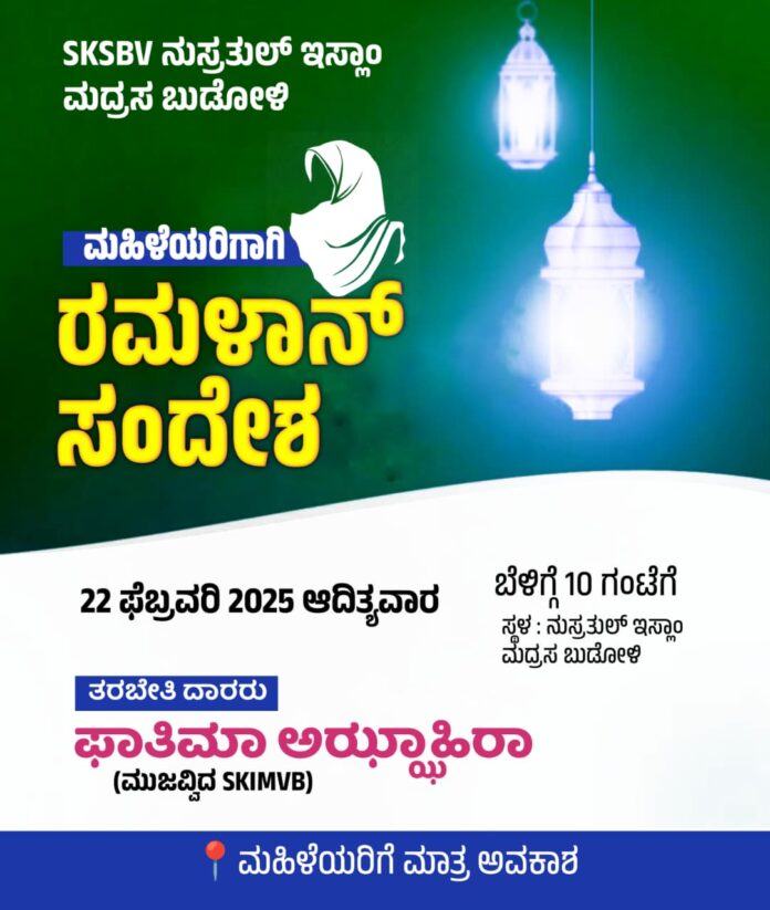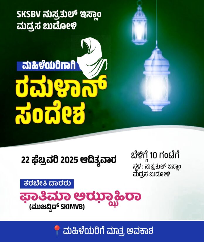 ಎಸ್.ಕೆ.ಎಸ್.ಬಿ.ವಿ ನುಸ್ರತುಲ್ ಇಸ್ಲಾಂ ಮದ್ರಸಾ ಬುಡೋಳಿ ಇದರ ವತಿಯಿಂದ ”ಮಹಿಳೆಯರಿಗಾಗಿ ರಮಳಾನ್ ಸಂದೇಶ” ಕಾರ್ಯಕ್ರಮವು ಫೆಬ್ರವರಿ 22 ರ ಆದಿತ್ಯವಾರ ಬೆಳಿಗ್ಗೆ ಹತ್ತು ಗಂಟೆಗೆ ನುಸ್ರತುಲ್ ಇಸ್ಲಾಂ ಮದ್ರಸಾ ಬುಡೋಳಿಯಲ್ಲಿ ನಡೆಯಲಿದೆ. ಎಸ್.ಕೆ.ಐ.ಎಂ.ವಿ.ಬಿ.ಯ ಮುಜವ್ವಿದ್ ಫಾತಿಮಾ ಅಝ್ಝಾಹಿರಾ ತರಬೇತಿ ನೀಡಲಿದ್ದಾರೆ. ಈ ಕಾರ್ಯಕ್ರಮಕ್ಕೆ ಸ್ತ್ರೀಯರಿಗೆ ಮಾತ್ರ ಅವಕಾಶ ಇದ್ದು ಈ ಕಾರ್ಯಕ್ರಮದ ಸದುಪಯೋಗವನ್ನು ಪಡೆಯಬೇಕೆಂದು ಇಂದು ಪ್ರಕಟಣೆಯಲ್ಲಿ ಖತೀಬ್ ಮುಹಮ್ಮದ್ ತಮೀಮ್ ಅನ್ಸಾರಿ ತಿಳಿಸಿದ್ದಾರೆ.