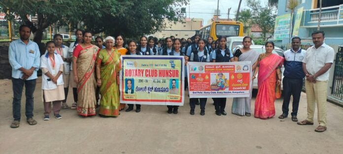 ಶುಕ್ರವಾರ ಹುಣಸೂರು ರೋಟರಿ ಕ್ಲಬ್ ಮತ್ತು ರೋಟರಿ ಶಾಲಾ ಮಕ್ಕಳೊಂದಿಗೆ ನಗರಸಭೆ ರಸ್ತೆ, ಸೇತುವೆ ರಸ್ತೆ, ಸಂವಿಧಾನ ವೃತ್ತದಿಂದ ಸಿಲ್ವರ್ ಜುಬ್ಲಿ ರಸ್ತೆ ಮೂಲಕ ತೆರಳಿ ಪೋಲಿಯೊ ಲಸಿಕೆ ಹಾಕಿಸಿ, ಮಕ್ಕಳ ಜೀವ ಉಳಿಸಿ ಎಂಬ ಸ್ಲೋಗೋನ್ ಹೇಳುವ ಮೂಲಕ ಪೋಲಿಯೊ ದಿನವನ್ನು ಜಾಥಾದೊಂದಿಗೆ ಅರಿವು ಮೂಡಿಸಲಾಯಿತು.