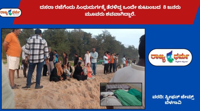 ಬೆಳಗಾವಿ: ದಸರಾ ರಜೆಗೆಂದು ಮಹಾರಾಷ್ಟ್ರದ ಸಿಂಧುದುರ್ಗಕ್ಕೆ ತೆರಳಿದ್ದ ಖಾನಾಪುರದ ಒಂದೇ ಕುಟುಂಬದ 8 ಜನರೂ ಸೀರೋಡಾ ಸಮುದ್ರದಲ್ಲಿ ಮುಳುಗಿ ಮೂವರು ಮೃತಪಟ್ಟ ಘಟನೆ ಶುಕ್ರವಾರ ನಡೆದಿದೆ.