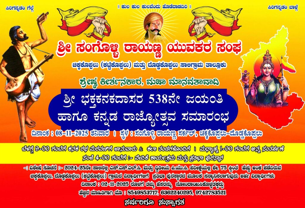 ಕೆ.ಆರ್.ನಗರ : ಸಾಲಿಗ್ರಾಮ ತಾಲೂಕಿನ ಚಿಕ್ಕಕೊಪ್ಪಲು ಮತ್ತು ದೊಡ್ಡಕೊಪ್ಪಲು ಅವಳಿ ಗ್ರಾಮದಲ್ಲಿ ನವೆಂಬರ್ 8 ರಂದು ಶ್ರೀ ಭಕ್ತಕನಕದಾಸರ 538ನೇ ಜಯಂತಿ ಕಾರ್ಯಕ್ರಮವನ್ನು ಆಯೋಜಿಸಲಾಗಿದೆ ಎಂದು ಗ್ರಾಮದ ಯಜಮಾನ್ ಟಿ.ಪುರುಷೋತ್ತೋಮ್ ಹೇಳಿದರು.