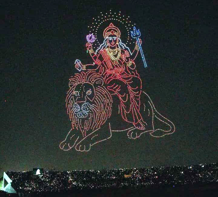 ಏಕಕಾಲದಲ್ಲಿ ಆಗಸಕ್ಕೆ ಲಗ್ಗೆ ಹಾಕಿದ ಡ್ರೋನ್ ಗಳು ಬಣ್ಣಬಣ್ಣದ ದೀಪಗಳಿಂದ ಮಿನುಗುತ್ತಾ ಆಕರ್ಷಕ ಕಲಾಕೃತಿಗಳನ್ನು ಸೃಷ್ಟಿಸಿದವು. ಸೌರಮಂಡಲ, ವಿಶ್ವಭೂಪಟ, ದೇಶದ ಹೆಮ್ಮೆಯ ಸೈನಿಕ, ನವಿಲು, ರಾಷ್ಟ್ರೀಯ ಪ್ರಾಣಿ ಹುಲಿ, ಡಾಲ್ಫಿನ್, ಈಗಲ್, ಸರ್ಪದ ಮೇಲೆ ಶ್ರೀಕೃಷ್ಣ ನೃತ್ಯ ಮಾಡುವುದು, ಕಾವೇರಿ ಮಾತೆ, ಕರ್ನಾಟಕ ಭೂಪಟದೊಂದಿಗೆ ಸಿದ್ದರಾಮಯ್ಯ ಹಾಗೂ ಡಿ.ಕೆ. ಶಿವಕುಮಾರ್ ಅವರ ಭಾವಚಿತ್ರದೊಂದಿಗೆ ಪಂಚ ಗ್ಯಾರಂಟಿ ಯೋಜನೆಗಳಿಂದ ಕೂಡಿದ್ದ ಕರ್ನಾಟಕ ಭೂಪಟ, ಅಂಬಾರಿ ಆನೆ, ನಾಡದೇವತೆ ಚಾಮುಂಡೇಶ್ವರಿ ಕಲಾಕೃತಿಗಳು ನೋಡುಗರಿಗೆ ಅದ್ಭುತ ಮನರಂಜನೆ ನೀಡಿದವು.
