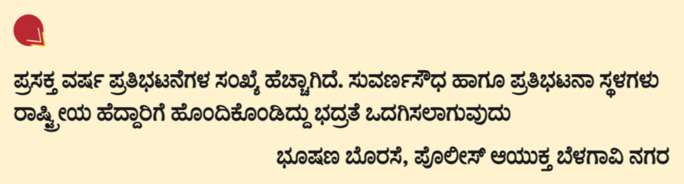 ಈ ಬಾರಿ ಪ್ರತಿಭಟನೆಗಳ ಸಂಖ್ಯೆ 100 ಗಡಿ ದಾಟುವ ಸಾಧ್ಯತೆ ಇದೆ. ರಾಜ್ಯದ ವಿವಿಧ ಸಂಘಟನೆಗಳು ಅನುಮತಿ ಪಡೆದಿವೆ ಎಂದು ಜಿಲ್ಲಾಡಳಿತ ಮೂಲಗಳು ತಿಳಿಸಿವೆ. ಸುವರ್ಣ ಉದ್ಯಾನದ ಖಾಲಿ ಜಾಗ ಹಾಗೂ ಹಳೆ ಪಿಬಿ ರಸ್ತೆ ಪಕ್ಕದಲ್ಲಿ ಪ್ರತಿಭಟನೆಗೆ ಶಾಮಿಯಾನ ಹಾಕಲಾಗಿದೆ. ಎರಡೂ ಕಡೆ ವೇದಿಕೆಗಳು ಧ್ವನಿವರ್ಧಕ ಸಲಕರಣೆ ನೀರು ನೆರಳಿನ ವ್ಯವಸ್ಥೆ ಮಾಡಲಾಗಿದೆ. ಸೌಧದಿಂದ ಒಂದೂವರೆ ಕಿ.ಮೀ ದೂರದಲ್ಲಿ ಟೆಂಟ್ ಸಿಟಿ ನಿರ್ಮಿಸಿದ್ದು ಅಲ್ಲಿ 2500 ಪೊಲೀಸರಿಗೆ ವಸತಿ ಕಲ್ಪಿಸಲಾಗಿದೆ. ಇವರು ಪ್ರತಿಭಟನೆಗಳ ಮೇಲೆ ನಿಗಾ ಇಡಲಿದ್ದಾರೆ.