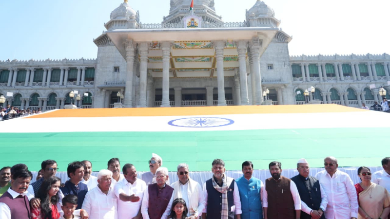 ಬೆಳಗಾವಿ: ಸುವರ್ಣಸೌಧದ ಭವ್ಯ ಮೆಟ್ಟಿಲುಗಳ ಮೇಲೆ ಮುಖ್ಯಮಂತ್ರಿ ಸಿದ್ದರಾಮಯ್ಯ ಅವರಿಂದು (ಡಿ.9) ವಿಶ್ವದಲ್ಲೇ ಎರಡನೇ ಅತಿದೊಡ್ಡ ಖಾದಿ ರಾಷ್ಟ್ರೀಯ ಧ್ವಜವನ್ನು ಅನಾವರಣಗೊಳಿಸಿದರು.