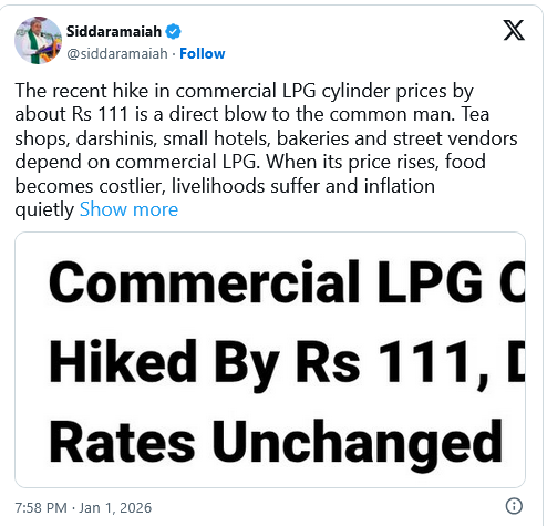 ಬೆಂಗಳೂರು: ವಾಣಿಜ್ಯ ಎಲ್‌ಪಿಜಿ ಸಿಲಿಂಡರ್ ಬೆಲೆಯಲ್ಲಿ ಸುಮಾರು 111 ರೂ. ಹೆಚ್ಚಳ ಮಾಡಿರುವುದು ಸಾಮಾನ್ಯ ಜನರಿಗೆ ನೇರ ಹೊಡೆತವಾಗಿದೆ ಎಂದು ಮುಖ್ಯಮಂತ್ರಿ ಸಿದ್ಧರಾಮಯ್ಯ ಅಸಮಾಧಾನ ವ್ಯಕ್ತಪಡಿಸಿದ್ದು, ಈ ಬಗ್ಗೆ ಸಾಮಾಜಿಕ ಜಾಲತಾಣ ಎಕ್ಸ್ ನಲ್ಲಿ ಪೋಸ್ಟ್ ಮಾಡಿರುವ ಅವರು, ವಾಣಿಜ್ಯ ಎಲ್‌ಪಿಜಿ ಸಿಲಿಂಡರ್ ಬೆಲೆಯಲ್ಲಿ ಸುಮಾರು 111 ರೂ. ಹೆಚ್ಚಳ ಮಾಡಿರುವುದು ಸಾಮಾನ್ಯ ಜನರಿಗೆ ನೇರ ಹೊಡೆತವಾಗಿದೆ.