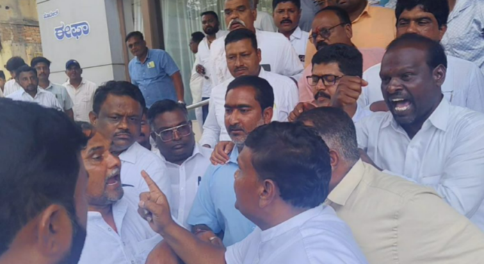 ಬೆಳಗಾವಿ: ಬೆಳಗಾವಿ ಡಿಸಿಸಿ ಬ್ಯಾಂಕ್ ನಿರ್ದೇಶಕರ ಚುನಾವಣೆಯಲ್ಲಿ ಹೈಡ್ರಾಮಾ ನಡೆದಿದ್ದು, ಭಾನುವಾರ ಖಾಸಗಿ ಹೋಟೆಲ್ ಬಳಿ ಪರಸ್ಪರ ಜಾರಕಿಹೊಳಿ ಮತ್ತು ಸವದಿ ಬಣದ ಬೆಂಬಲಿಗರು ಮಾರಾಮಾರಿ ನಡೆಸಿದ ಘಟನೆ ನಡೆದಿದೆ.