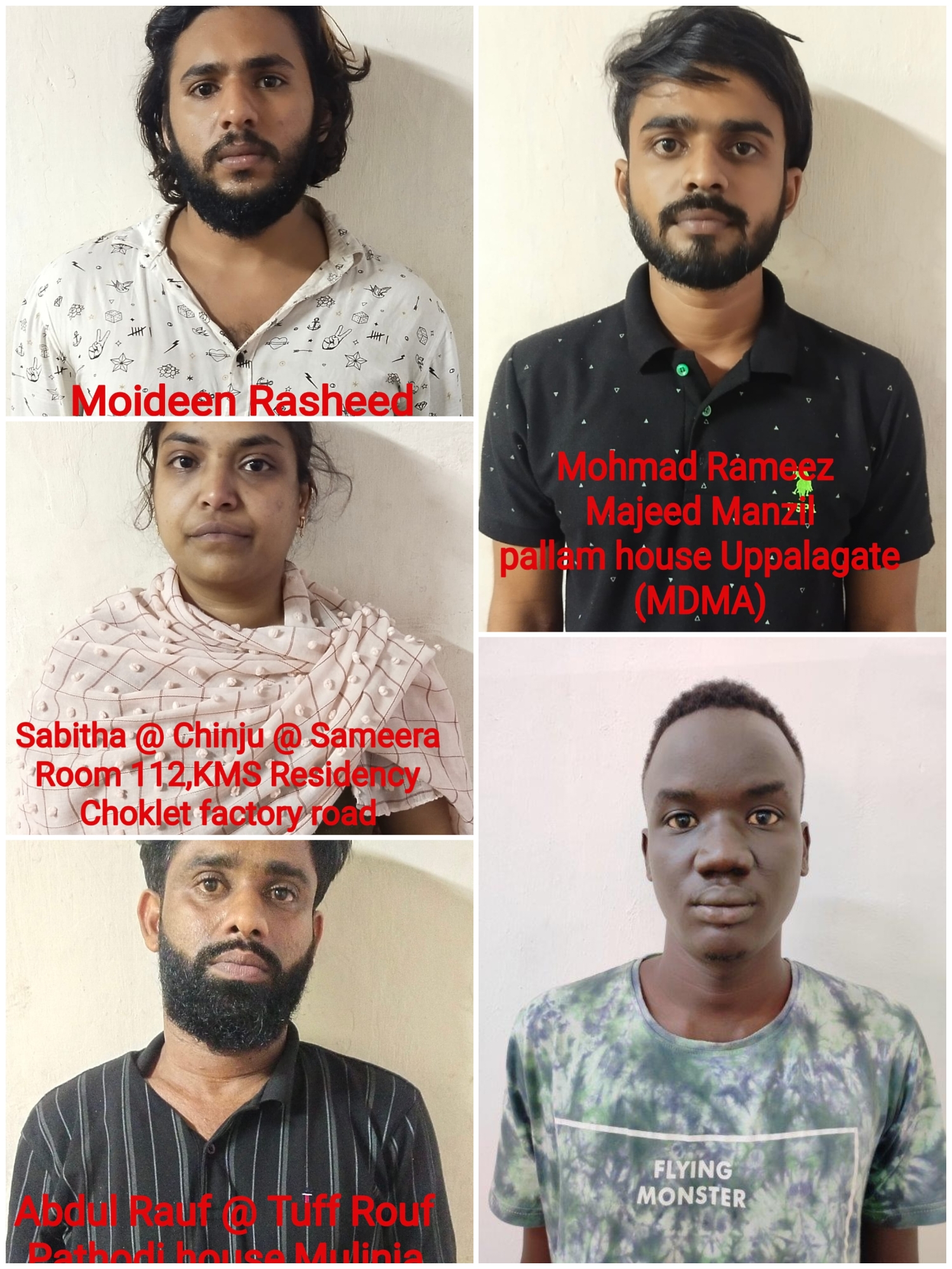 ಎನ್ಡಿಪಿಎಸ್ ಆ್ಯಕ್ಟ್ 21, 21(ಸಿ) ಪ್ರಕಾರ ಆರೋಪಿ ಲೋವೆಲ್ ಡೇನಿಯಲ್ ಜಸ್ಟಿನ್ ಬೌಲೋ ಅಲಿಯಾಸ್ ಡ್ಯಾನಿಗೆ 12 ವರ್ಷ ಜೈಲು ಸಜೆ ಮತ್ತು 1,25 ,000 ದಂಡ, ಮುಹಮ್ಮದ್ ರಮೀಜ್ಗೆ 14 ವರ್ಷ ಮತ್ತು 1,45,000 ದಂಡ , ಮೊಯಿದ್ದೀನ್ ರಶೀದ್ಗೆ 12 ವರ್ಷ ಮತ್ತು 1,25,000 ದಂಡ, ಅಬ್ದುಲ್ ರವೂಫ್ಗೆ 13 ವರ್ಷ ಮತ್ತು 1,35,000 ದಂಡ, ಸಬಿತಾಗೆ 12 ವರ್ಷ ಮತ್ತು 1, 25,000 ದಂಡ ವಿಧಿಸಿ ನ್ಯಾಯಾಲಯವು ತೀರ್ಪು ನೀಡಿದೆ.