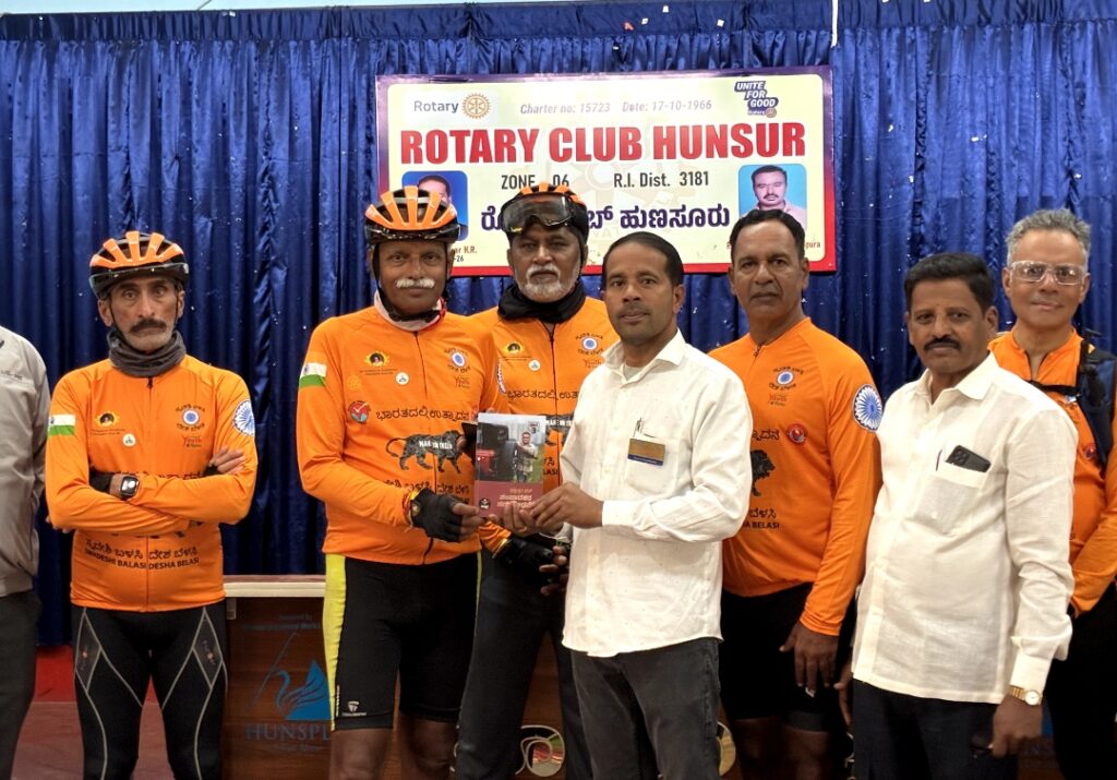 ನಗರದ ರೋಟರಿ ಭವನಕ್ಕೆ ಭೇಟಿ ನೀಡಿ ಬೆಂಗಳೂರಿನಿಂದ ಸೈಕ್ಲಿಂಗ್ ಮೂಲಕ ಜಾಥಾ ಹೊರಟು ರೋಟರಿ ಶಾಲಾ ಮಕ್ಕಳಿಗೆ ಸ್ವದೇಶಿ ಬಳಸಿ, ಭಾರತ ಉಳಿಸಿ ಎಂಬ ವೇದವಾಕ್ಯದೊಂದಿಗೆ ಕರ್ನಾಟಕದ ಎಲ್ಲಡೆ ಸಾವಿರಾರು ಮೈಲಿಗಳನ್ನು ಸೈಕ್ಲಿಂಗ್ ಮೂಲಕ ಅರಿವು ಮೂಡಿಸಲಾಗುತ್ತಿದೆ ಎಂದರು.