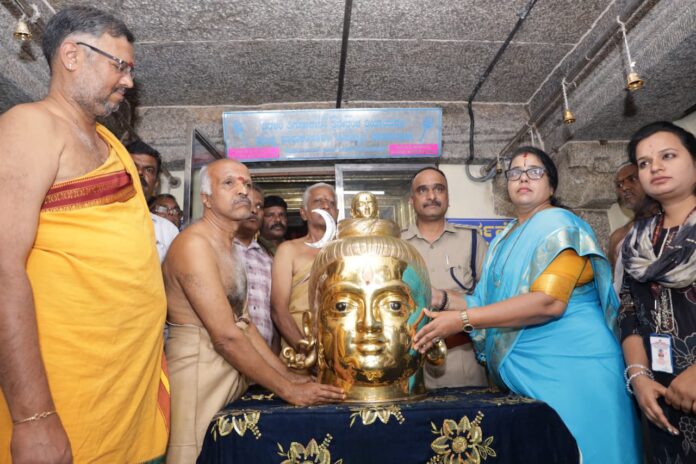 ಮೈಸೂರು: ಮಹಾ ಶಿವರಾತ್ರಿ ಪ್ರಯುಕ್ತ ಅರಮನೆಯ ಆವರಣದಲ್ಲಿರುವ ತ್ರಿನೇತ್ರೇಶ್ವರ ಸ್ವಾಮಿ ದೇವಸ್ಥಾನಕ್ಕೆ ಪ್ರತಿವರ್ಷದಂತೆ ಜಿಲ್ಲಾ ಖಜಾನೆಯಿಂದ ಸೂಕ್ತ ಭದ್ರತೆಯೊಂದಿಗೆ ಚಿನ್ನದ ಕೊಳಗವನ್ನು ತರಲಾಯಿತು. ಚಾಮುಂಡಿ ಬೆಟ್ಟ ಕ್ಷೇತ್ರ ಅಭಿವೃದ್ಧಿ ಪ್ರಾಧಿಕಾರದ ಕಾರ್ಯದರ್ಶಿ ಡಿ.ರೂಪ ಮತ್ತು ಅರಮನೆ ಆಡಳಿತ ಮಂಡಳಿ ಸಿಬ್ಬಂದಿ ಸಮ್ಮುಖದಲ್ಲಿ ಸುಮಾರು 11 ಕೆ.ಜಿ ಇರುವ ಶುದ್ದ ಚಿನ್ನದ ಕೊಳಗವನ್ನು ದೇವಾಲಯದ ಅರ್ಚಕರಿಗೆ ಹಸ್ತಾಂತರ ಮಾಡಲಾಯಿತು.