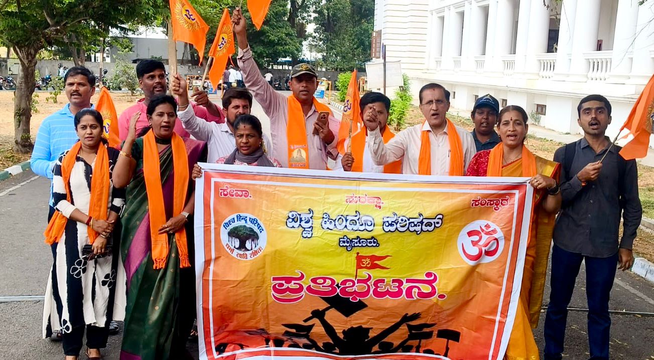 ಮೈಸೂರು : ಹಿಂದೂಗಳ ಧಾರ್ಮಿಕ ಭಾವನೆಗೆ ಧಕ್ಕೆ ತರುವಂತೆ ನಡೆದುಕೊಂಡವರ ವಿರುದ್ಧ ಸೂಕ್ತ ಕ್ರಮ ಜರುಗಿಸುವಂತೆ ಒತ್ತಾಯಿಸಿ ವಿಶ್ವ ಹಿಂದೂ ಪರಿಷದ್ ಮೈಸೂರಿನ ಜಿಲ್ಲಾಧಿಕಾರಿಯ ಕಚೇರಿಯ ಮುಂದೆ ಪ್ರತಿಭಟನೆ ನಡೆಸಿತು.