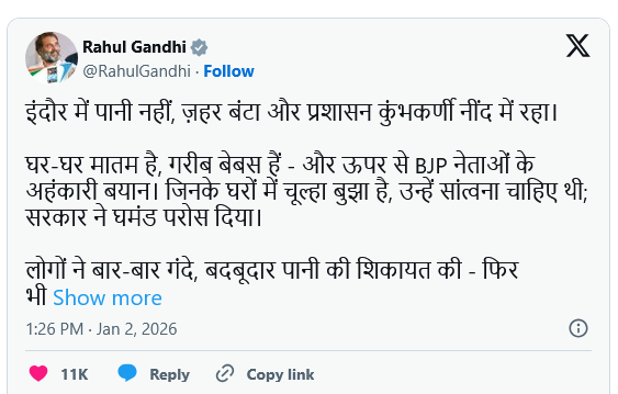 ಈ ಕುರಿತು ತಮ್ಮ ಎಕ್ಸ್ ಖಾತೆಯಲ್ಲಿ ಪೋಸ್ಟ್ ಹಂಚಿಕೊಂಡಿರುವ ಅವರು, ಆಡಳಿತಾರೂಢ ಬಿಜೆಪಿ ಸರ್ಕಾರವನ್ನ ತರಾಟೆಗೆ ತೆಗೆದುಕೊಂಡಿದ್ದು, ಬಿಜೆಪಿ ಆಡಳಿತ ಗಾಢ ನಿದ್ರೆಯಲ್ಲಿದೆ. ಇಂದೋರ್ನಲ್ಲಿ ನೀರು ಇರಲಿಲ್ಲ, ಆದ್ದರಿಂದ ವಿಷ ಹಂಚಲಾಗಿದೆ ಎಂದು ಅಸಮಾಧಾನ ಹೊರಹಾಕಿದ್ದಾರೆ.