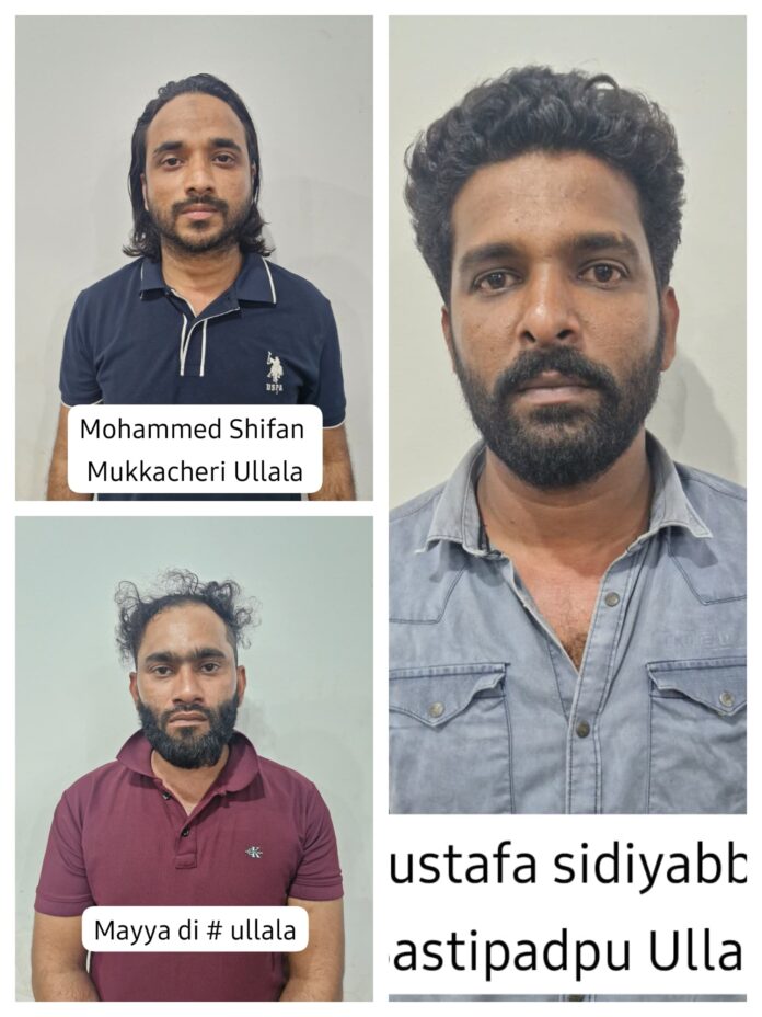 ಬಂಧಿತ ಆರೋಪಿಗಳನ್ನು ಬಸ್ತಿಪಡ್ಪು ನಿವಾಸಿ ಮುಸ್ತಫಾ ಸೀದಿಯಬ್ಬ (34), ಕೋಡಿ, ಡಿ ರೋಡ್ ನಿವಾಸಿ ಮೈಯದ್ದಿ, ಮುಕಚೇರಿ ನಿವಾಸಿ ಶಿಫಾನ್(28) ಎಂದು ಗುರುತಿಸಲಾಗಿದೆ.