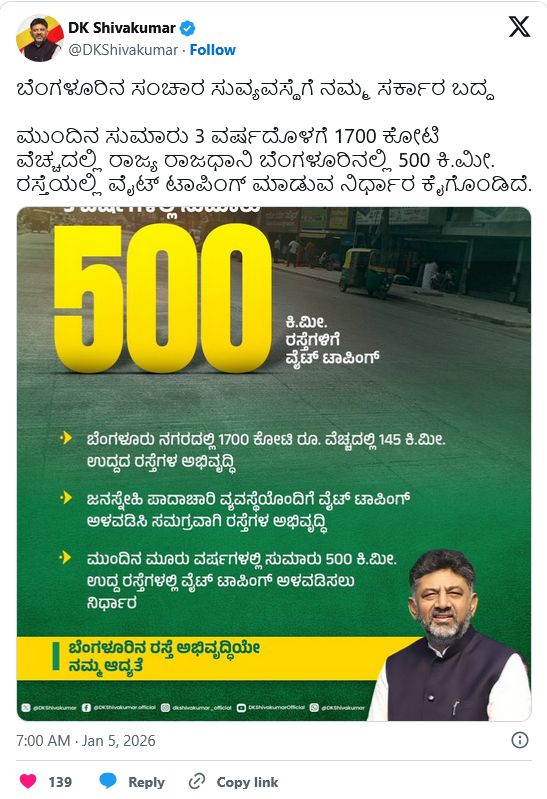 ಬೆಂಗಳೂರು: ನಗರದ 500 ಕಿಮೀ ರಸ್ತೆಗಳಿಗೆ ವೈಟ್ ಟಾಪಿಂಗ್ ಮಾಡಲು ರಾಜ್ಯ ಸರ್ಕಾರ ಮಹತ್ವದ ನಿರ್ಧಾರ ಕೈಗೊಂಡಿದ್ದು, ಮುಂದಿನ ಸುಮಾರು 3 ವರ್ಷದೊಳಗೆ 1,700 ಕೋಟಿ ರೂ. ವೆಚ್ಚದಲ್ಲಿ ರಾಜ್ಯ ರಾಜಧಾನಿ ಬೆಂಗಳೂರಿನಲ್ಲಿ 500 ಕಿ.ಮೀ. ರಸ್ತೆಯಲ್ಲಿ ವೈಟ್ ಟಾಪಿಂಗ್ ಮಾಡುವ ನಿರ್ಧಾರ ಕೈಗೊಂಡಿದೆ ಎಂದು ಬೆಂಗಳೂರು ಉಸ್ತುವಾರಿ ಸಚಿವ, ಡಿಸಿಎಂ ಡಿಕೆ ಶಿವಕುಮಾರ್ ಹೇಳಿದ್ದಾರೆ.