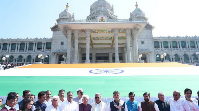 ಈ ವೇಳೆ ಮುಖ್ಯಮಂತ್ರಿಗಳು ಮಾತನಾಡಿ, ವಿಧಾನಸಭೆಯ ಭವ್ಯ ಮೆಟ್ಟಿಲುಗಳ ಮೇಲೆ ಜಗತ್ತಿನ ಎರಡನೆ ಅತಿ ದೊಡ್ಡ ರಾಷ್ಟ್ರಧ್ವಜ ಅನಾವರಣಕ್ಕೆ ಶ್ರಮಿಸಿ ಉತ್ತಮ ಕಾರ್ಯ ಮಾಡಿದ ಸಭಾಧ್ಯಕ್ಷರಾದ ಯು.ಟಿ.ಖಾದರ್ ಮತ್ತು ಅವರ ತಂಡದವರಿಗೆ ಮತ್ತು ಈ ಧ್ವಜ ನೇಯ್ಗೆಗೆ ಶ್ರಮಿಸಿದ ಕಲಬುರಗಿ ಜಿಲ್ಲೆಯ ಕಮಲಾಪುರದ ವಿನೋದಕುಮಾರ ರೇವಪ್ಪ ಬೊಮ್ಮಣ್ಣವರ ಅವರಿಗೆ ಸರ್ಕಾರದಿಂದ ಅಭಿನಂದನೆ ತಿಳಿಸುವೆ ಎಂದರು. ಖಾದಿಯು ಕೇವಲ ವಸ್ತ್ರ ಅಲ್ಲ; ಅದು ದೇಶದ ಹೆಮ್ಮಯ ಸಂಕೇತ ಎಂದರು.