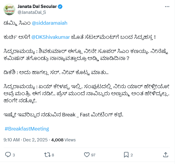 ಇಷ್ಟೇ ಇವರಿಬ್ಬರ ನಡುವಿನ Break _ Fast ಮೀಟಿಂಗ್ ಕಥೆ ಎಂದು ಜೆಡಿಎಸ್ ವ್ಯಂಗ್ಯ ಮಾಡಿದೆ.
